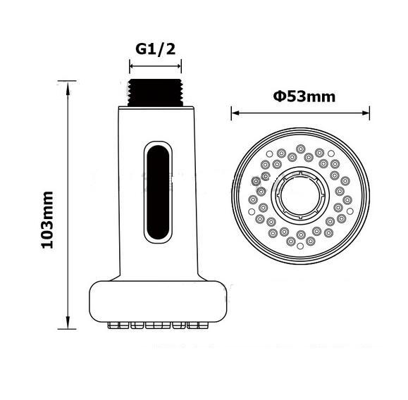 | البعد الرئيسي من دش الحنفية | 1). وجه القطر: 53 * 53mm 2). ارتفاع رأس دش اليد: 103mm. 3). البعد المتصل: G1 / 2. (حجم الدولي، مناسبة لمعظم صنبور). |